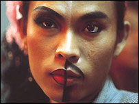 Ons sien hier ‘n vrou waarvan die regterkantste deel gegrimeer is om soos ‘n man te lyk. Die meeste van u het seker al gehoor van die term ‘n Drag Queen – daardie homoseksuele mans wat elke jaar opgetooi is as vroue in ‘n optog. Nou wel hierdie vroue wat hulle self aantrek soos manne is die vroulike ekwivalent van Drag Queens. In die lesbiese wêreld noem hulle dit ‘n Drag King. Hierdie verskynsel kom veral voor onder Homoseksuele vroue.